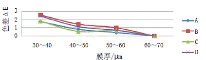 由表 3 和图 1 可看出, 4 种钛白粉的变化趋势一致,都是随着膜厚的减少色差越来越大,但是色差增加的幅度不同,说明不同的钛白粉其遮盖力是有差别的。从变化趋势上看,可认为遮盖力 B<D<A<C 。由此可知,实际生产中应该考虑钛白粉的遮盖情况,酌情选择钛白粉以节省成本,特别是薄涂产品更应该考虑使用遮盖力好的钛白粉以便达到薄涂遮盖的目的。