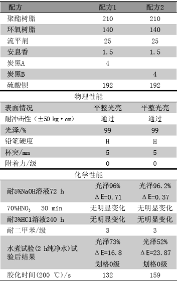 表 4 的试验结果表明,不同厂家生产的炭黑配制的粉末涂料涂膜光泽、机械强度等技术指标基本一致,但耐化学试验结果差异较大,如耐碱试验(耐 5%NaOH 溶液 72 h )后色差有不同程度的变化 ; 水煮 2h 试验后光泽较水煮试验前变化较大,色差变化差异很大 ; 说明两种炭黑耐水性能差别较大,炭黑 A 耐水性能 > 炭黑 B 。在粉末涂料实际配方设计时应考虑到炭黑的耐水性能,特别是客户要求在潮湿条件下使用时应该慎重选择炭黑颜料。两种炭黑胶化时间相差较大,从涂膜流平看炭黑 A 的流平次于炭黑 B 的流平,见表 5 。