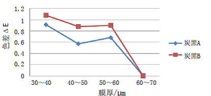 表 5 不同膜厚条件下,炭黑颜料对粉末涂料色差的影响