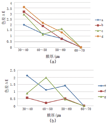 图 3 不同膜厚下,无机有色颜料的色差变化