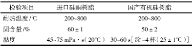有机硅树脂(技术指标见表 1 ),其他原材料,包括溶剂、耐高温颜填料、助剂等。