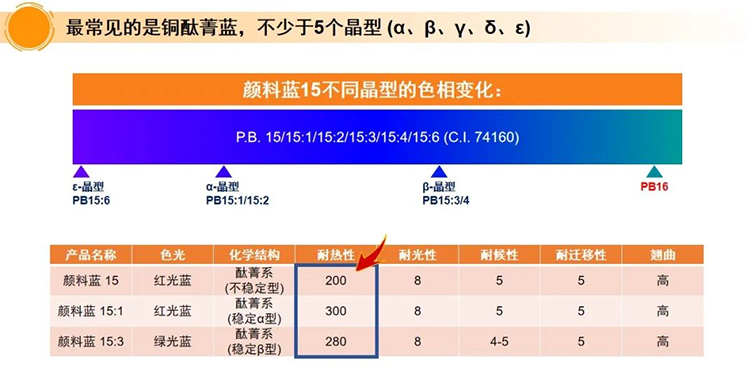 最常见的是铜酞菁蓝,不少于5个晶型(α、β、γ、δ、ε)。多晶状态不意味着不同晶型之间有非常明显的区别;在很多情况下颜色以及特性非常相似。