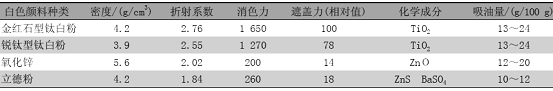 无机颜料是涂料工业中应用量最大、应用面最广的颜料,主要用于遮盖、着色、保护、防腐蚀等。而针对粉末涂料行业,在选择颜料时针对性越来越强,标准越来越高。目前,粉末涂料中使用的黑色颜料主要是炭黑、铁黑。但铁黑耐温性差,固化温度高于 150 ℃ 时不推荐使用。虽然其具有良好的抗紫外线性能,但烘烤过程中容易变色,且遮盖力较炭黑差,所以在粉末涂料中很少使用。红色无机颜料主要使用铁红、钼铬红两种类型的颜料。氧化铁颜料价格低廉、无毒、易分散,在粉末涂料中应用很普遍,其中红色和褐色氧化铁颜料有良好的热稳定性、耐碱和耐稀酸、耐光和耐候性也很好,更受到粉末涂料调色师的青睐。黄色无机颜料主要是铁黄、铬黄两种类型的颜料。白色无机颜料主要有氧化锌、立德粉、钛白粉 ( 金红石型钛白粉和锐钛型钛白粉 ) 等,但现代金红石型钛白粉颜料在白度、遮盖力、消色力、光泽促进性、分散性、保旋光性、保色性、抗粉化性诸方面,都达到了极高的程度,粉末涂料中应用最多的白色颜料是金红石型钛白 粉。表 1 是几种白色颜料主要性能对比。